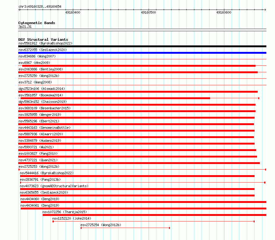Variant DetailsVariant: esv2725253 | Internal ID | 10308889 | | Landmark | | | Location Information | | | Cytoband | 3p21.31 | | Allele length | | Assembly | Allele length | | hg38 | 327 | | hg19 | 327 |