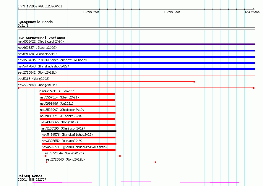 Variant DetailsVariant: esv2725843| Internal ID | 10309479 | | Landmark | | | Location Information | | | Cytoband | 3q21.1 | | Allele length | | Assembly | Allele length | | hg38 | 293 | | hg19 | 293 |