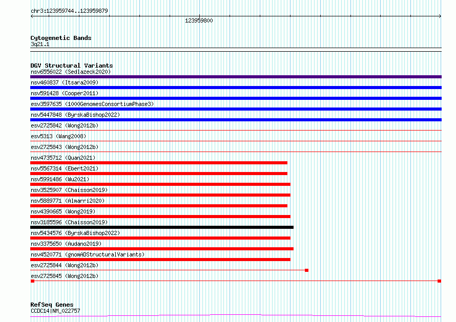 Variant DetailsVariant: esv2725845| Internal ID | 10309481 | | Landmark | | | Location Information | | | Cytoband | 3q21.1 | | Allele length | | Assembly | Allele length | | hg38 | 136 | | hg19 | 136 |