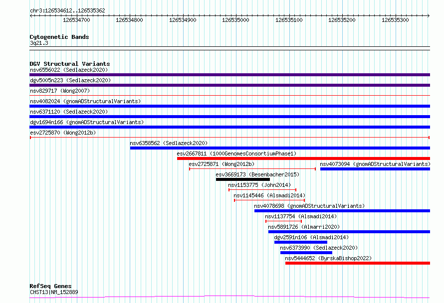 Variant DetailsVariant: esv2725870| Internal ID | 10309506 | | Landmark | | | Location Information | | | Cytoband | 3q21.3 | | Allele length | | Assembly | Allele length | | hg38 | 751 | | hg19 | 751 |