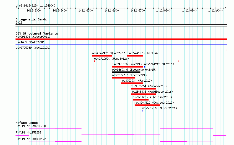 Variant DetailsVariant: esv2725989| Internal ID | 10309625 | | Landmark | | | Location Information | | | Cytoband | 3q23 | | Allele length | | Assembly | Allele length | | hg38 | 811 | | hg19 | 811 |