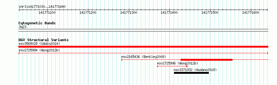 Variant DetailsVariant: esv2725994| Internal ID | 9960300 | | Landmark | | | Location Information | | | Cytoband | 3q23 | | Allele length | | Assembly | Allele length | | hg38 | 611 | | hg19 | 611 |