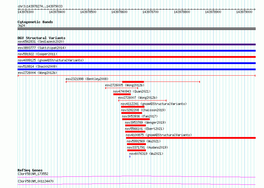 Variant DetailsVariant: esv2726004| Internal ID | 10309640 | | Landmark | | | Location Information | | | Cytoband | 3q24 | | Allele length | | Assembly | Allele length | | hg38 | 760 | | hg19 | 760 |