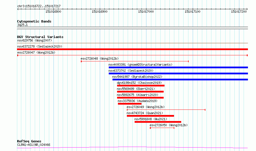 Variant DetailsVariant: esv2726047| Internal ID | 10309683 | | Landmark | | | Location Information | | | Cytoband | 3q25.1 | | Allele length | | Assembly | Allele length | | hg38 | 496 | | hg19 | 496 |
