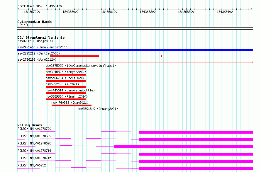 Variant DetailsVariant: esv2726298| Internal ID | 10309934 | | Landmark | | | Location Information | | | Cytoband | 3q27.1 | | Allele length | | Assembly | Allele length | | hg38 | 609 | | hg19 | 609 |