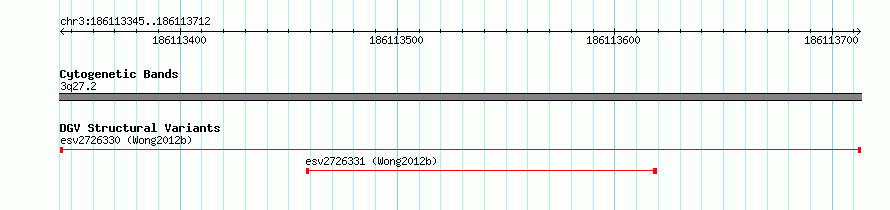 Variant DetailsVariant: esv2726330| Internal ID | 9960637 | | Landmark | | | Location Information | | | Cytoband | 3q27.2 | | Allele length | | Assembly | Allele length | | hg38 | 368 | | hg19 | 368 |