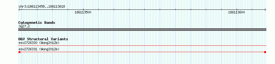 Variant DetailsVariant: esv2726331| Internal ID | 9960638 | | Landmark | | | Location Information | | | Cytoband | 3q27.2 | | Allele length | | Assembly | Allele length | | hg38 | 161 | | hg19 | 161 |
