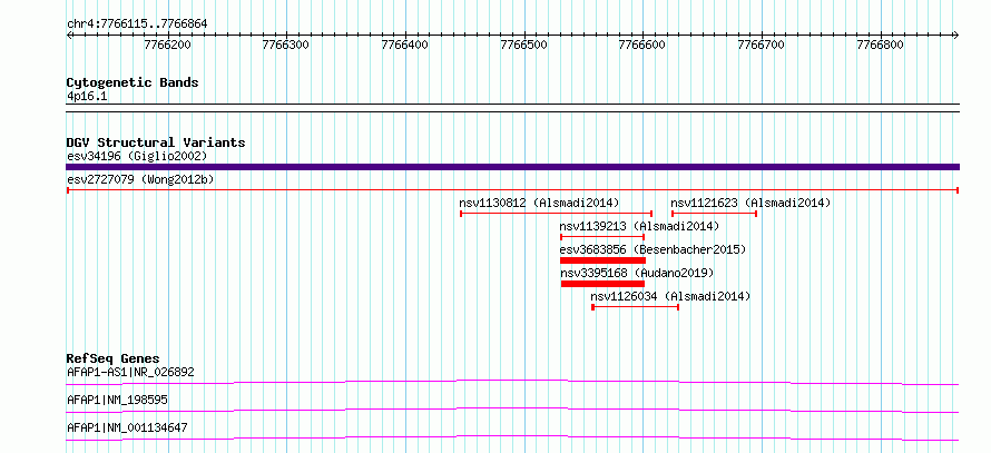 Variant DetailsVariant: esv2727079 | Internal ID | 9961387 | | Landmark | | | Location Information | | | Cytoband | 4p16.1 | | Allele length | | Assembly | Allele length | | hg38 | 750 | | hg19 | 750 |