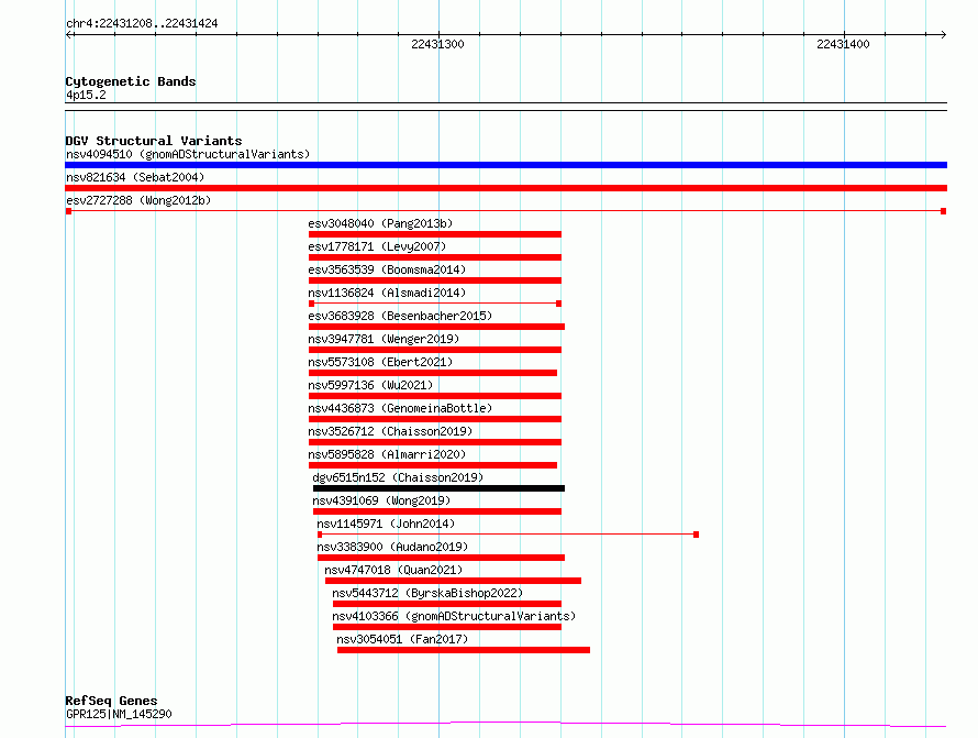 Variant DetailsVariant: esv2727288| Internal ID | 10310924 | | Landmark | | | Location Information | | | Cytoband | 4p15.2 | | Allele length | | Assembly | Allele length | | hg38 | 217 | | hg19 | 217 |