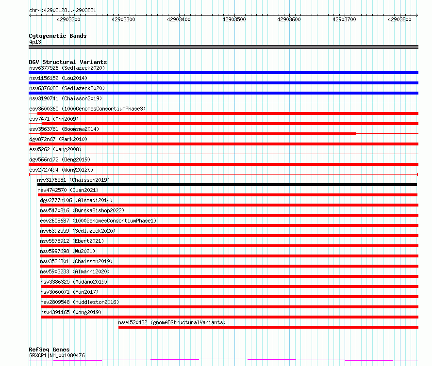 Variant DetailsVariant: esv2727494 | Internal ID | 10311130 | | Landmark | | | Location Information | | | Cytoband | 4p13 | | Allele length | | Assembly | Allele length | | hg38 | 704 | | hg19 | 704 |
