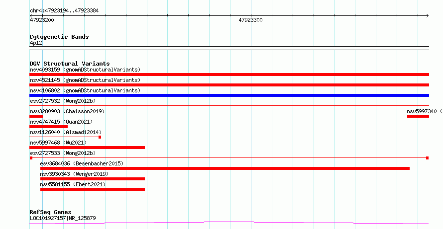 Variant DetailsVariant: esv2727533| Internal ID | 10311169 | | Landmark | | | Location Information | | | Cytoband | 4p12 | | Allele length | | Assembly | Allele length | | hg38 | 191 | | hg19 | 191 |