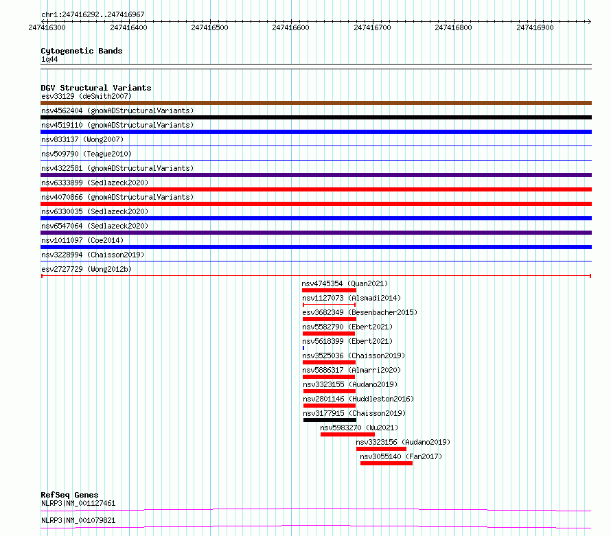 Variant DetailsVariant: esv2727729| Internal ID | 10311365 | | Landmark | | | Location Information | | | Cytoband | 1q44 | | Allele length | | Assembly | Allele length | | hg38 | 676 | | hg19 | 676 |