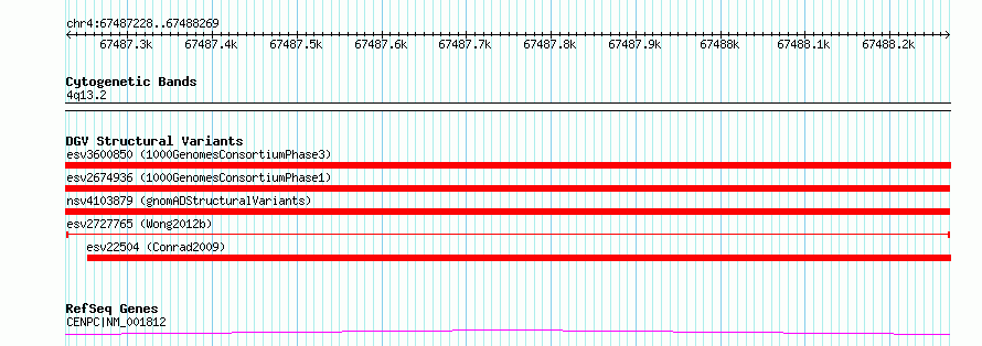 | | Variant Type | CNV deletion | | Copy Number | | | Allele State | | | Allele Origin | | | Probe Count | | | Validation Flag | | | Merged Status | M | | Merged Variants | | | Supporting Variants | essv6730418, essv6794172 | | Samples | SSM071, SSM047 | | Known Genes | CENPC | | Method | Sequencing | | Analysis | Breakdancer:4 times standard deviation,VariationHunter:4 times standard deviation and at least 3 supportting reads | | Platform | Illumina HiSeq 2000 | | Comments | | | Reference | Wong_et_al_2012b | | Pubmed ID | 23290073 | | Accession Number(s) | esv2727765