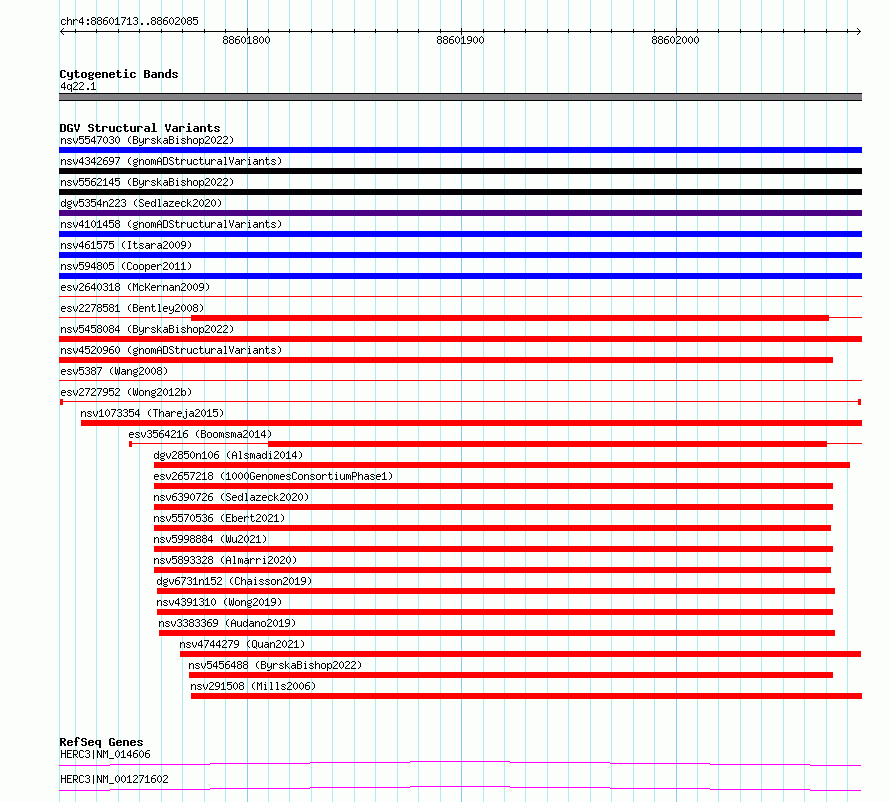 | | Variant Type | CNV deletion | | Copy Number | | | Allele State | | | Allele Origin | | | Probe Count | | | Validation Flag | | | Merged Status | M | | Merged Variants | | | Supporting Variants | essv6805073, essv6748394, essv6907002, essv6973931, essv6942832, essv6903305, essv6825915, essv6676067, essv6679987, essv6883872, essv6934210, essv6844562, essv6756253, essv6711426, essv6813922, essv6781760, essv6869362, essv6770358, essv6833372, essv6860241, essv6802230, essv6704594, essv6700537, essv6693706, essv6865032, essv6690027, essv6754156, essv6956213, essv6757079, essv6726685, essv6893080, essv6810942, essv6872379, essv6899312, essv6767170, essv6938527, essv6878267, essv6947369 | | Samples | SSM100, SSM059, SSM036, SSM008, SSM024, SSM046, SSM064, SSM065, SSM039, SSM013, SSM073, SSM093, SSM074, SSM042, SSM088, SSM023, SSM058, SSM090, SSM021, SSM029, SSM026, SSM089, SSM032, SSM014, SSM033, SSM085, SSM068, SSM040, SSM082, SSM080, SSM037, SSM077, SSM076, SSM022, SSM091, SSM095, SSM098, SSM056 | | Known Genes | HERC3 | | Method | Sequencing | | Analysis | Breakdancer:4 times standard deviation,VariationHunter:4 times standard deviation and at least 3 supportting reads | | Platform | Illumina HiSeq 2000 | | Comments | | | Reference | Wong_et_al_2012b | | Pubmed ID | 23290073 | | Accession Number(s) | esv2727952