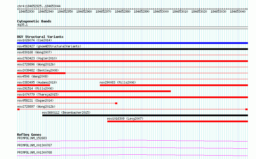 Variant DetailsVariant: esv2728897| Internal ID | 9963212 | | Landmark | | | Location Information | | | Cytoband | 4q35.1 | | Allele length | | Assembly | Allele length | | hg38 | 120 | | hg19 | 120 |
