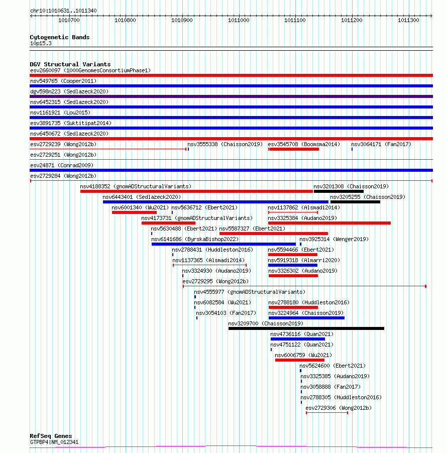 Variant DetailsVariant: esv2729284| Internal ID | 10312920 | | Landmark | | | Location Information | | | Cytoband | 10p15.3 | | Allele length | | Assembly | Allele length | | hg38 | 710 | | hg19 | 710 |