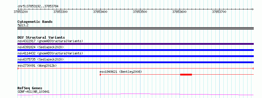 Variant DetailsVariant: esv2730091| Internal ID | 10313727 | | Landmark | | | Location Information | | | Cytoband | 5p13.2 | | Allele length | | Assembly | Allele length | | hg38 | 593 | | hg19 | 593 |