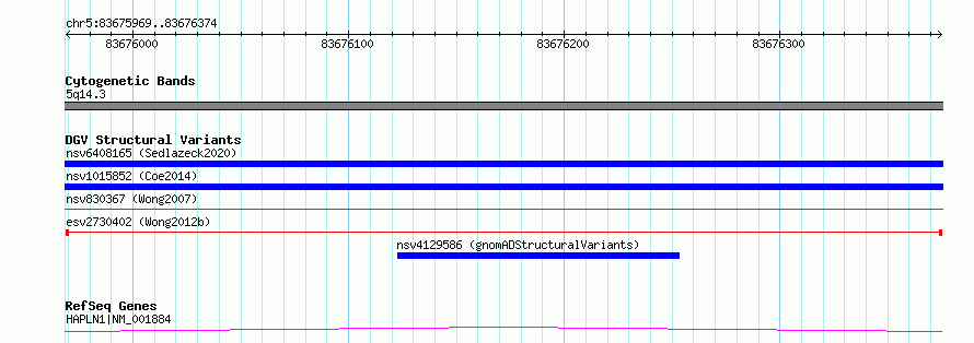 Variant DetailsVariant: esv2730402| Internal ID | 10314038 | | Landmark | | | Location Information | | | Cytoband | 5q14.3 | | Allele length | | Assembly | Allele length | | hg38 | 406 | | hg19 | 406 |