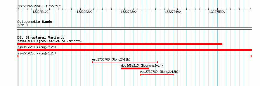Variant DetailsVariant: esv2730786| Internal ID | 9965103 | | Landmark | | | Location Information | | | Cytoband | 5q31.1 | | Allele length | | Assembly | Allele length | | hg38 | 529 | | hg19 | 529 |