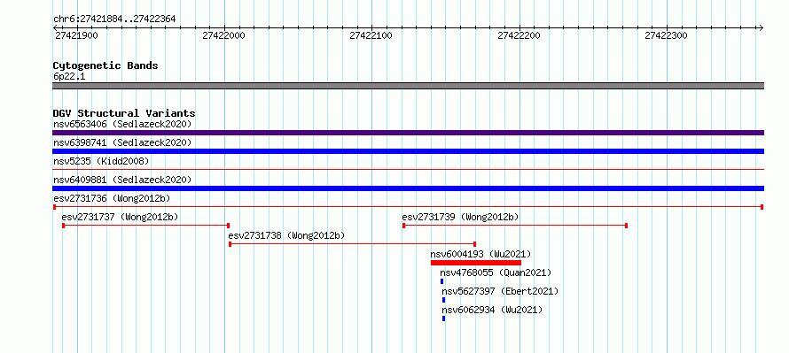 Variant DetailsVariant: esv2731736| Internal ID | 10315372 | | Landmark | | | Location Information | | | Cytoband | 6p22.1 | | Allele length | | Assembly | Allele length | | hg38 | 481 | | hg19 | 481 |
