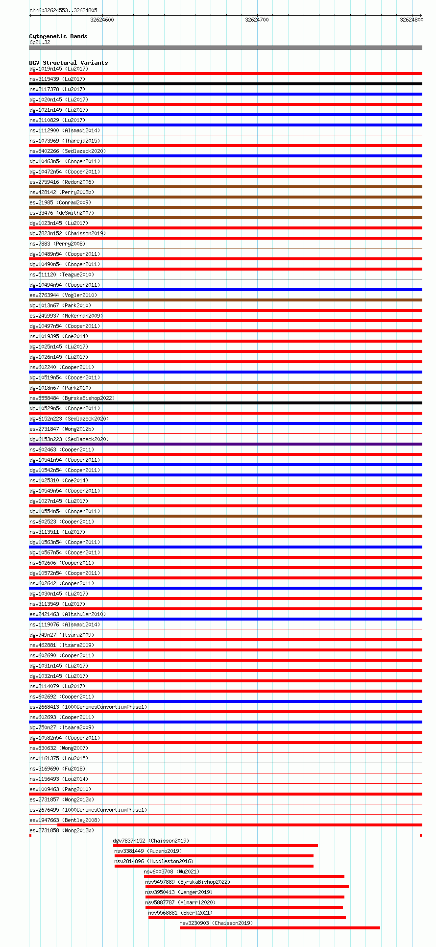 Variant DetailsVariant: esv2731858| Internal ID | 10315494 | | Landmark | | | Location Information | | | Cytoband | 6p21.32 | | Allele length | | Assembly | Allele length | | hg38 | 253 | | hg19 | 253 |