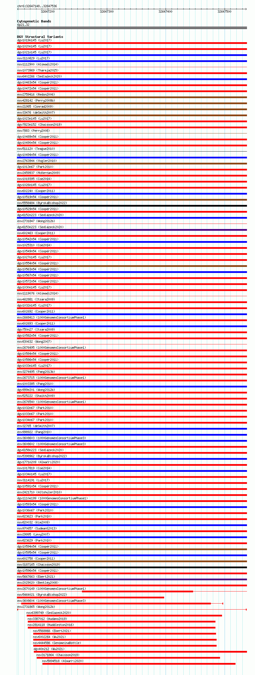 Variant DetailsVariant: esv2731865 | Internal ID | 10315501 | | Landmark | | | Location Information | | | Cytoband | 6p21.32 | | Allele length | | Assembly | Allele length | | hg38 | 389 | | hg19 | 389 |