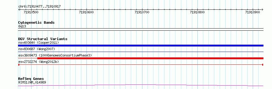 | Variant Type | CNV deletion | Copy Number | | Allele State | | Allele Origin | | Probe Count | | Validation Flag | | Merged Status | M | Merged Variants | | Supporting Variants | essv6969421, essv6679110, essv6907615 | Samples | SSM028, SSM014, SSM005 | Known Genes | RIMS1 | Method | Sequencing | Analysis | Breakdancer:4 times standard deviation,VariationHunter:4 times standard deviation and at least 3 supportting reads | Platform | Illumina HiSeq 2000 | Comments | | Reference | Wong_et_al_2012b | Pubmed ID | 23290073 | Accession Number(s) | esv2732274
