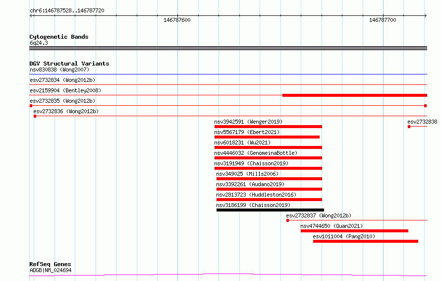 Variant DetailsVariant: esv2732835| Internal ID | 10316471 | | Landmark | | | Location Information | | | Cytoband | 6q24.3 | | Allele length | | Assembly | Allele length | | hg38 | 193 | | hg19 | 193 |
