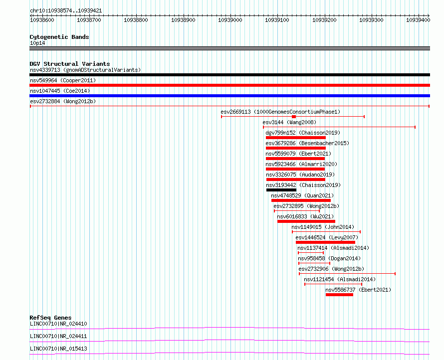 Variant DetailsVariant: esv2732884 | Internal ID | 10316520 | | Landmark | | | Location Information | | | Cytoband | 10p14 | | Allele length | | Assembly | Allele length | | hg38 | 848 | | hg19 | 848 |