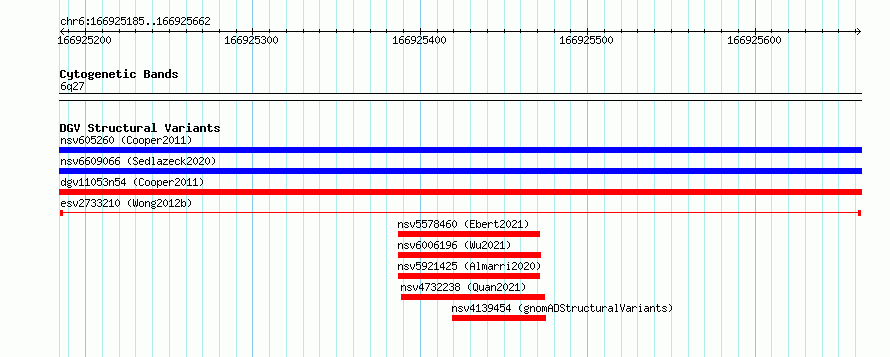 Variant DetailsVariant: esv2733210| Internal ID | 10316846 | | Landmark | | | Location Information | | | Cytoband | 6q27 | | Allele length | | Assembly | Allele length | | hg38 | 478 | | hg19 | 478 |