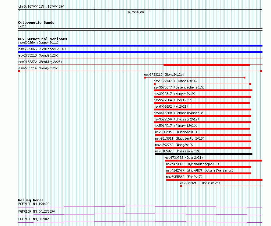 Variant DetailsVariant: esv2733214| Internal ID | 10316850 | | Landmark | | | Location Information | | | Cytoband | 6q27 | | Allele length | | Assembly | Allele length | | hg38 | 176 | | hg19 | 176 |
