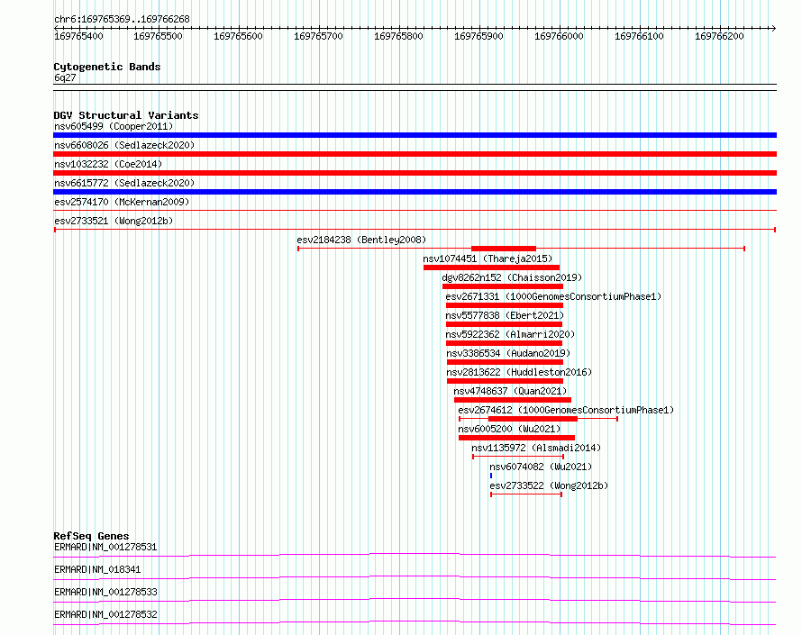 Variant DetailsVariant: esv2733521| Internal ID | 10317157 | | Landmark | | | Location Information | | | Cytoband | 6q27 | | Allele length | | Assembly | Allele length | | hg38 | 900 | | hg19 | 900 |