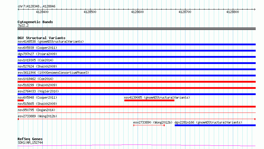 | Variant Type | CNV deletion | Copy Number | | Allele State | | Allele Origin | | Probe Count | | Validation Flag | | Merged Status | M | Merged Variants | | Supporting Variants | essv6865810, essv6808574 | Samples | SSM075, SSM089 | Known Genes | SDK1 | Method | Sequencing | Analysis | Breakdancer:4 times standard deviation,VariationHunter:4 times standard deviation and at least 3 supportting reads | Platform | Illumina HiSeq 2000 | Comments | | Reference | Wong_et_al_2012b | Pubmed ID | 23290073 | Accession Number(s) | esv2733889