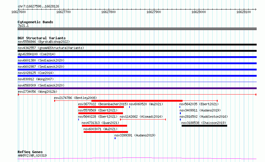 Variant DetailsVariant: esv2734056| Internal ID | 10317692 | | Landmark | | | Location Information | | | Cytoband | 7p21.1 | | Allele length | | Assembly | Allele length | | hg38 | 529 | | hg19 | 529 |