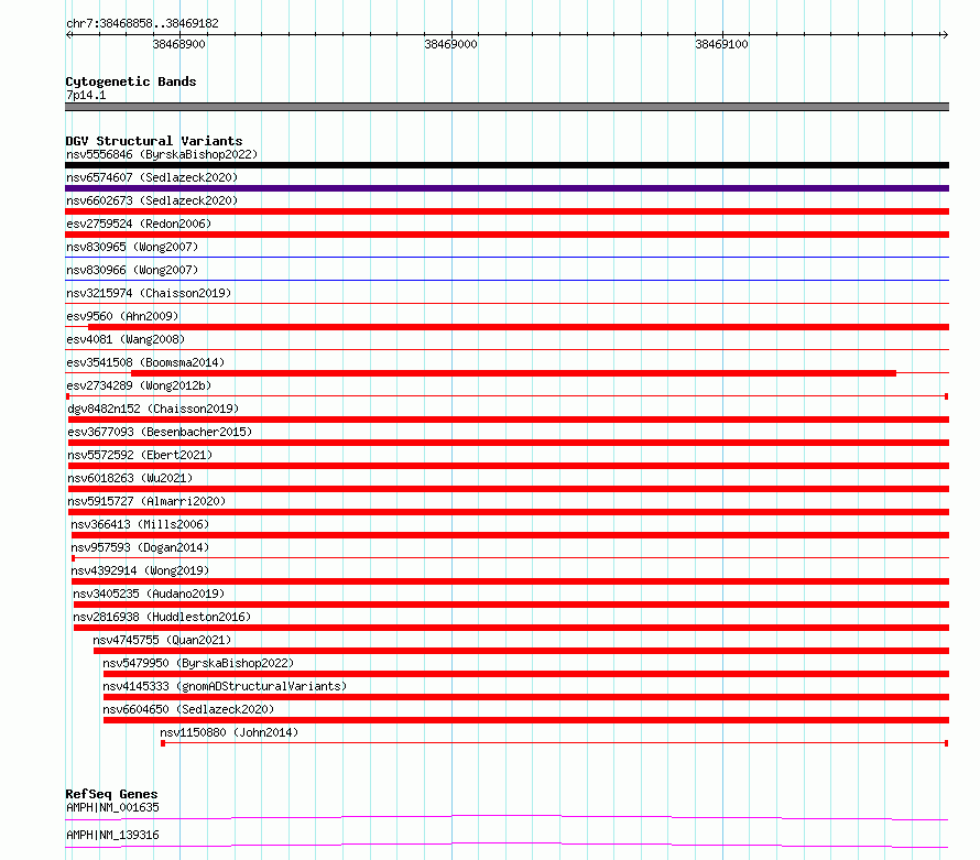 Variant DetailsVariant: esv2734289 | Internal ID | 10317925 | | Landmark | | | Location Information | | | Cytoband | 7p14.1 | | Allele length | | Assembly | Allele length | | hg38 | 325 | | hg19 | 325 |