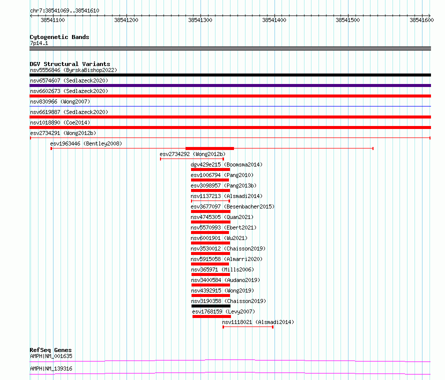 Variant DetailsVariant: esv2734291| Internal ID | 10317927 | | Landmark | | | Location Information | | | Cytoband | 7p14.1 | | Allele length | | Assembly | Allele length | | hg38 | 542 | | hg19 | 542 |