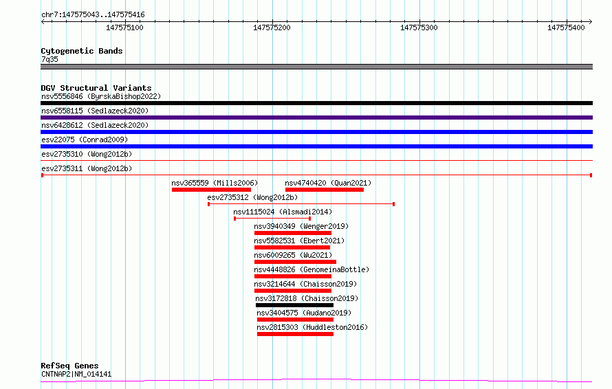 Variant DetailsVariant: esv2735311| Internal ID | 10318947 | | Landmark | | | Location Information | | | Cytoband | 7q35 | | Allele length | | Assembly | Allele length | | hg38 | 374 | | hg19 | 374 |