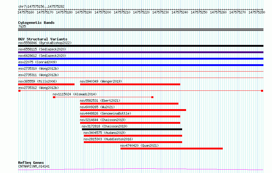 Variant DetailsVariant: esv2735312| Internal ID | 10318948 | | Landmark | | | Location Information | | | Cytoband | 7q35 | | Allele length | | Assembly | Allele length | | hg38 | 127 | | hg19 | 127 |