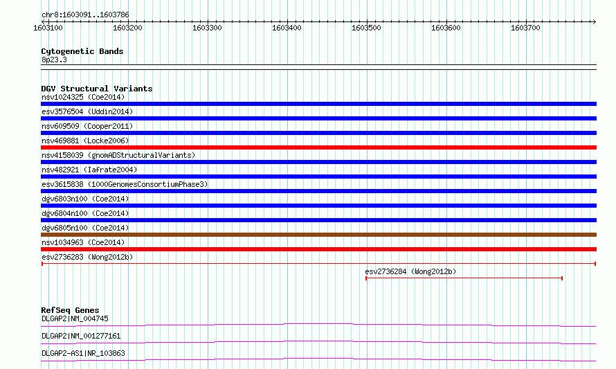 | Variant Type | CNV deletion | Copy Number | | Allele State | | Allele Origin | | Probe Count | | Validation Flag | | Merged Status | M | Merged Variants | | Supporting Variants | essv6952525, essv6897158, essv6782811, essv6923613, essv6811737, essv6904283, essv6733166, essv6771395, essv6856093, essv6680954, essv6884633, essv6834297, essv6775098, essv6894041, essv6876157 | Samples | SSM065, SSM087, SSM013, SSM092, SSM018, SSM033, SSM066, SSM068, SSM082, SSM007, SSM076, SSM095, SSM025, SSM099, SSM098 | Known Genes | DLGAP2, LOC100507435 | Method | Sequencing | Analysis | Breakdancer:4 times standard deviation,VariationHunter:4 times standard deviation and at least 3 supportting reads | Platform | Illumina HiSeq 2000 | Comments | | Reference | Wong_et_al_2012b | Pubmed ID | 23290073 | Accession Number(s) | esv2736283