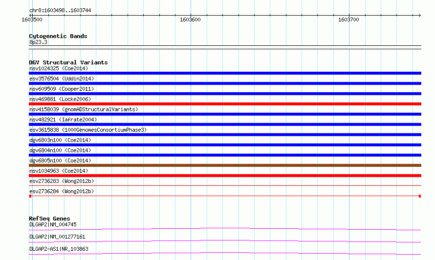 | Variant Type | CNV deletion | Copy Number | | Allele State | | Allele Origin | | Probe Count | | Validation Flag | | Merged Status | M | Merged Variants | | Supporting Variants | essv6894041 | Samples | SSM098 | Known Genes | DLGAP2, LOC100507435 | Method | Sequencing | Analysis | Breakdancer:4 times standard deviation,VariationHunter:4 times standard deviation and at least 3 supportting reads | Platform | Illumina HiSeq 2000 | Comments | | Reference | Wong_et_al_2012b | Pubmed ID | 23290073 | Accession Number(s) | esv2736284