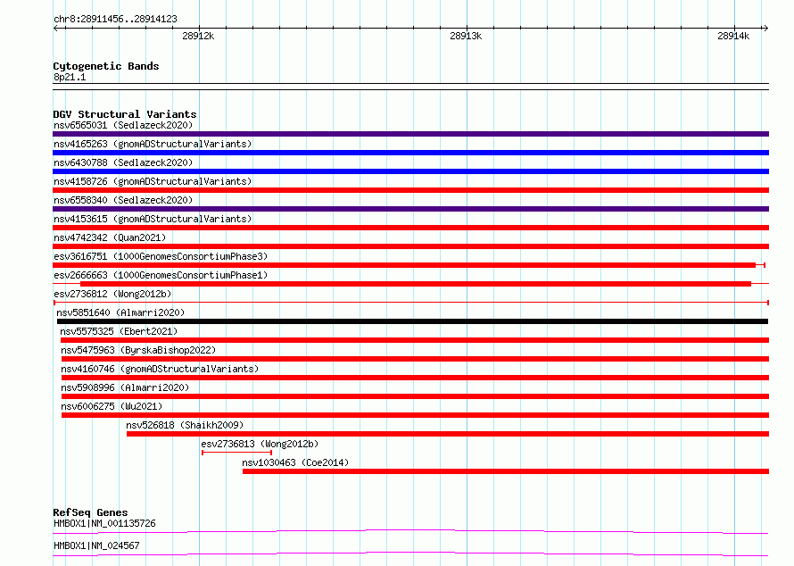 Variant DetailsVariant: esv2736812| Internal ID | 10320448 | | Landmark | | | Location Information | | | Cytoband | 8p21.1 | | Allele length | | Assembly | Allele length | | hg38 | 2668 | | hg19 | 2668 |
