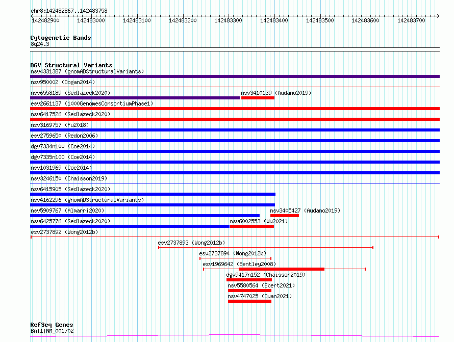 | | Variant Type | CNV deletion | | Copy Number | | | Allele State | | | Allele Origin | | | Probe Count | | | Validation Flag | | | Merged Status | M | | Merged Variants | | | Supporting Variants | essv6755112, essv6768089, essv6894277, essv6876260, essv6801576, essv6787177, essv6709050, essv6799641, essv6958298, essv6681084, essv6677274, essv6976126, essv6948515, essv6870345, essv6964890, essv6935513, essv6667945, essv6894172, essv6884737, essv6814979, essv6749278, essv6723961, essv6701862, essv6887584 | | Samples | SSM027, SSM024, SSM045, SSM064, SSM039, SSM009, SSM041, SSM058, SSM092, SSM090, SSM021, SSM069, SSM029, SSM096, SSM026, SSM032, SSM033, SSM072, SSM077, SSM095, SSM098, SSM056, SSM030, SSM012 | | Known Genes | BAI1 | | Method | Sequencing | | Analysis | Breakdancer:4 times standard deviation,VariationHunter:4 times standard deviation and at least 3 supportting reads | | Platform | Illumina HiSeq 2000 | | Comments | | | Reference | Wong_et_al_2012b | | Pubmed ID | 23290073 | | Accession Number(s) | esv2737892