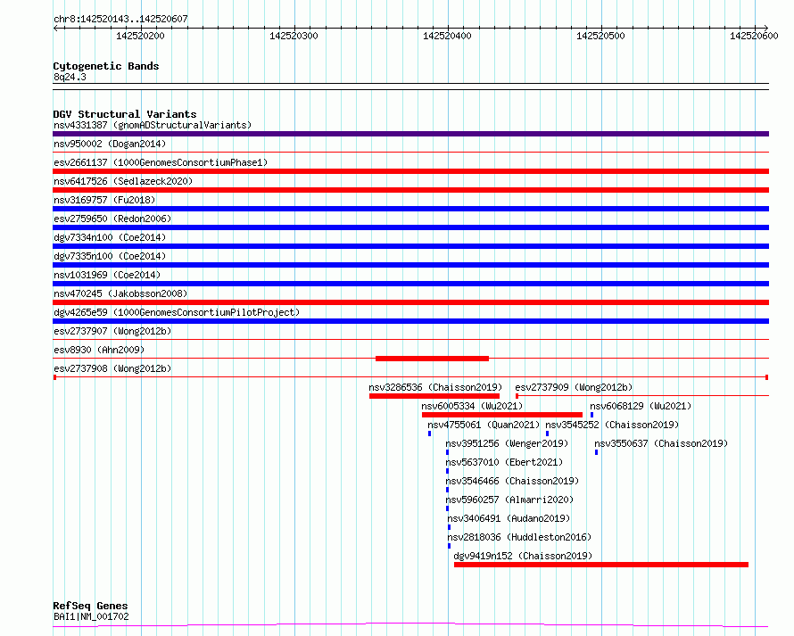 | | Variant Type | CNV deletion | | Copy Number | | | Allele State | | | Allele Origin | | | Probe Count | | | Validation Flag | | | Merged Status | M | | Merged Variants | | | Supporting Variants | essv6952667, essv6904413, essv6691135, essv6791280, essv6799644, essv6684627, essv6787179, essv6927455, essv6866459, essv6850324, essv6823100, essv6931247, essv6894173, essv6727808, essv6900236, essv6672252, essv6908330, essv6866460, essv6887586, essv6716233, essv6861353 | | Samples | SSM100, SSM036, SSM046, SSM011, SSM079, SSM013, SSM069, SSM096, SSM089, SSM019, SSM031, SSM014, SSM086, SSM072, SSM020, SSM070, SSM025, SSM034, SSM043, SSM098 | | Known Genes | BAI1 | | Method | Sequencing | | Analysis | Breakdancer:4 times standard deviation,VariationHunter:4 times standard deviation and at least 3 supportting reads | | Platform | Illumina HiSeq 2000 | | Comments | | | Reference | Wong_et_al_2012b | | Pubmed ID | 23290073 | | Accession Number(s) | esv2737908