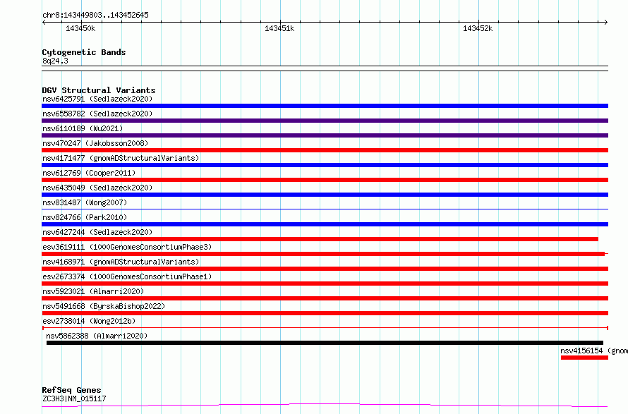 Variant DetailsVariant: esv2738014| Internal ID | 10321650 | | Landmark | | | Location Information | | | Cytoband | 8q24.3 | | Allele length | | Assembly | Allele length | | hg38 | 2843 | | hg19 | 2843 |