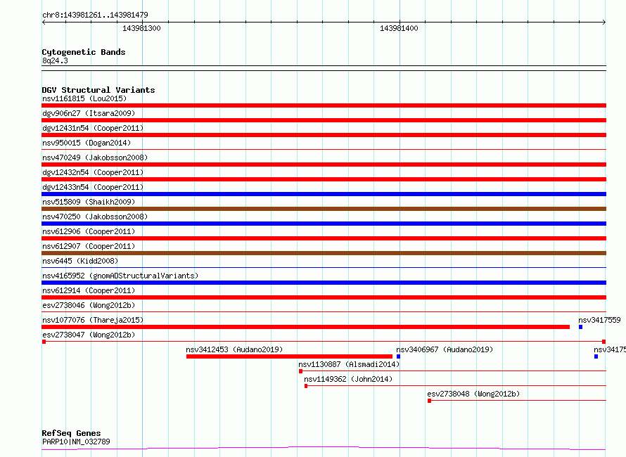 Variant DetailsVariant: esv2738047| Internal ID | 9972386 | | Landmark | | | Location Information | | | Cytoband | 8q24.3 | | Allele length | | Assembly | Allele length | | hg38 | 219 | | hg19 | 219 |