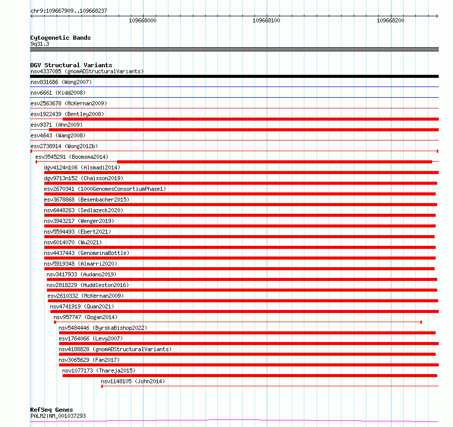 Variant DetailsVariant: esv2738914 | Internal ID | 10322550 | | Landmark | | | Location Information | | | Cytoband | 9q31.3 | | Allele length | | Assembly | Allele length | | hg38 | 329 | | hg19 | 329 |