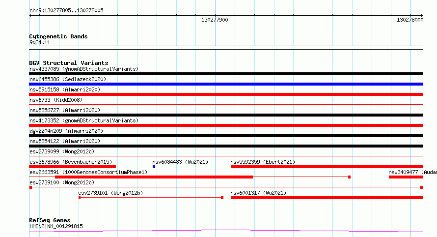 Variant DetailsVariant: esv2739100| Internal ID | 10322736 | | Landmark | | | Location Information | | | Cytoband | 9q34.11 | | Allele length | | Assembly | Allele length | | hg38 | 201 | | hg19 | 201 |