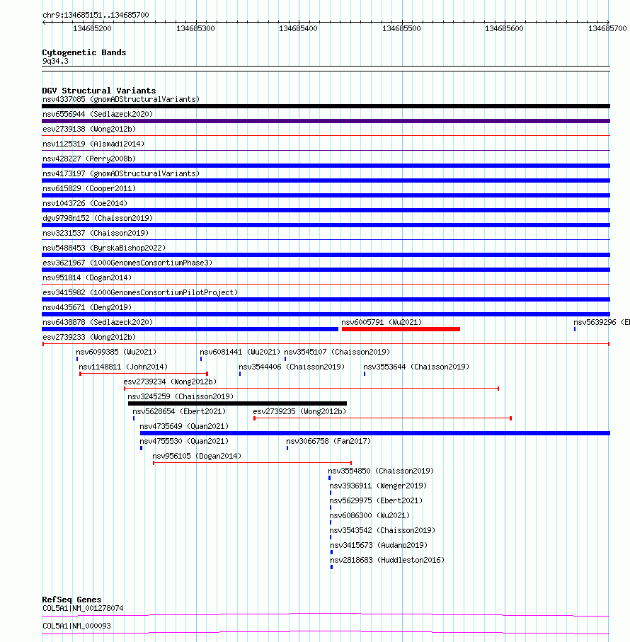 Variant DetailsVariant: esv2739233| Internal ID | 10322869 | | Landmark | | | Location Information | | | Cytoband | 9q34.3 | | Allele length | | Assembly | Allele length | | hg38 | 550 | | hg19 | 550 |