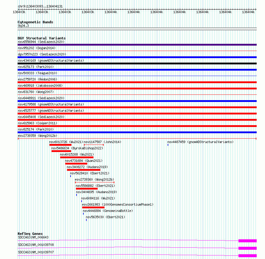Variant DetailsVariant: esv2739359| Internal ID | 10322995 | | Landmark | | | Location Information | | | Cytoband | 9q34.3 | | Allele length | | Assembly | Allele length | | hg38 | 1039 | | hg19 | 1039 |