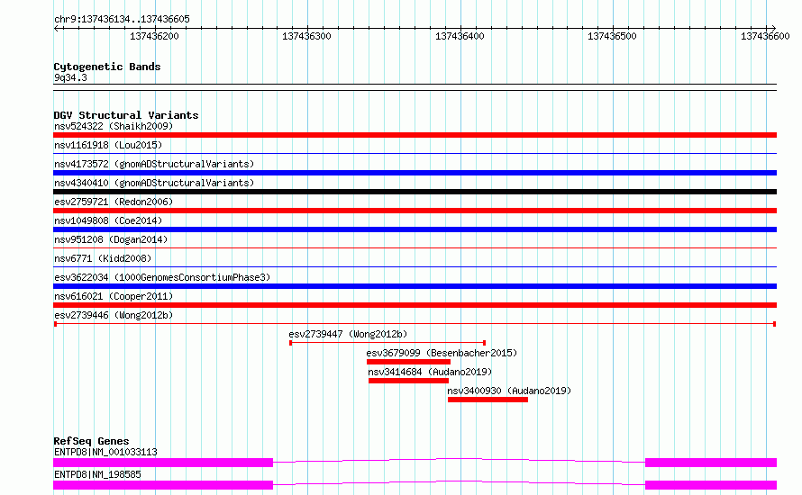 Variant DetailsVariant: esv2739446| Internal ID | 9973787 | | Landmark | | | Location Information | | | Cytoband | 9q34.3 | | Allele length | | Assembly | Allele length | | hg38 | 472 | | hg19 | 472 |